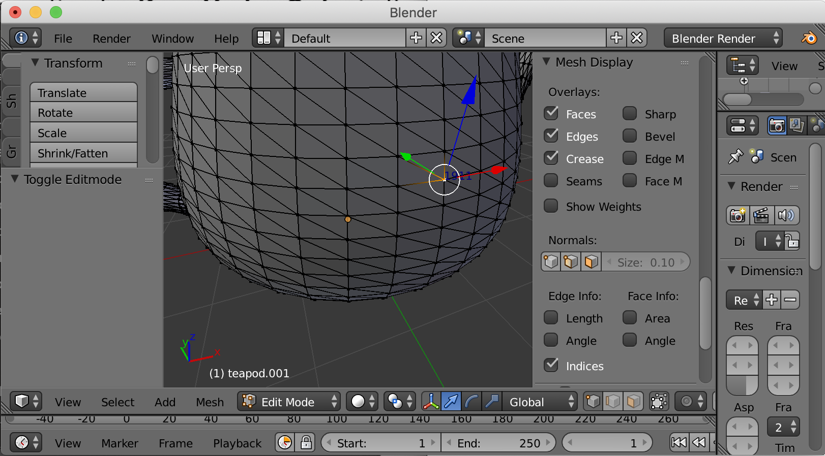 그리고 'N' 키를 누르면 오른쪽에 뭐라고 하는지 잘 모르겠지만 선택된 모델에 대한 여러가지 정보같은게 나오는 창이 뜬다. 이 창의 좀 아랫부분에 보면 Mesh Display 그룹에 Edge Info 라는 항목이 있다. 여기에 Indices 체크박스를 체크하면 정점 인덱스 정보가 화면에 표시된다.