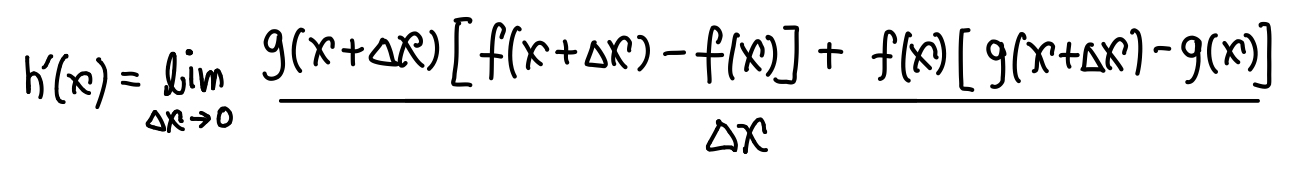 h(x) = f(x)g(x) 라고 하고, h'(x)를 구한다고 해 보자(h(x)는 x의 위치에서 미분 가능하다는 가정). 그리고 미분의 정의는 아래와 같다는 사실을 염두해두자.