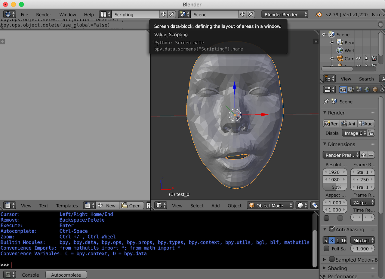 우선 정점 인덱스가 잘 선택되었는지 알아보기 위해 Blender를 디버그 모드로 띄웠다. https://koodev.tistory.com/39 참고. 그리고 대상 모델을 로드하자.