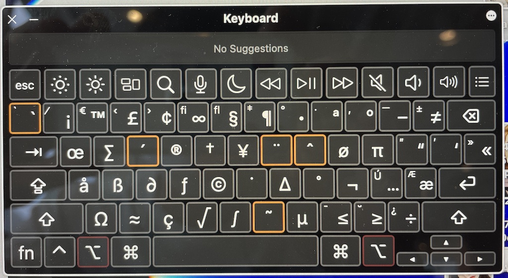 Computer사용 중인 맥북(16인치, M1pro)에서 키보드 타이핑 시 이상한 문자가 입력되는 현상이 발생했다. 좀 더 정확히는 오른쪽 option 키가 항상 눌려진 것처럼 타이핑이 되고 있었다. 즉, asdf 를 입력하면 åß∂ƒ 가 입력된다. 또한 마우스 커서와 관련된 다른 동작도 오른쪽 option 키가 눌려진 영향을 받았다.